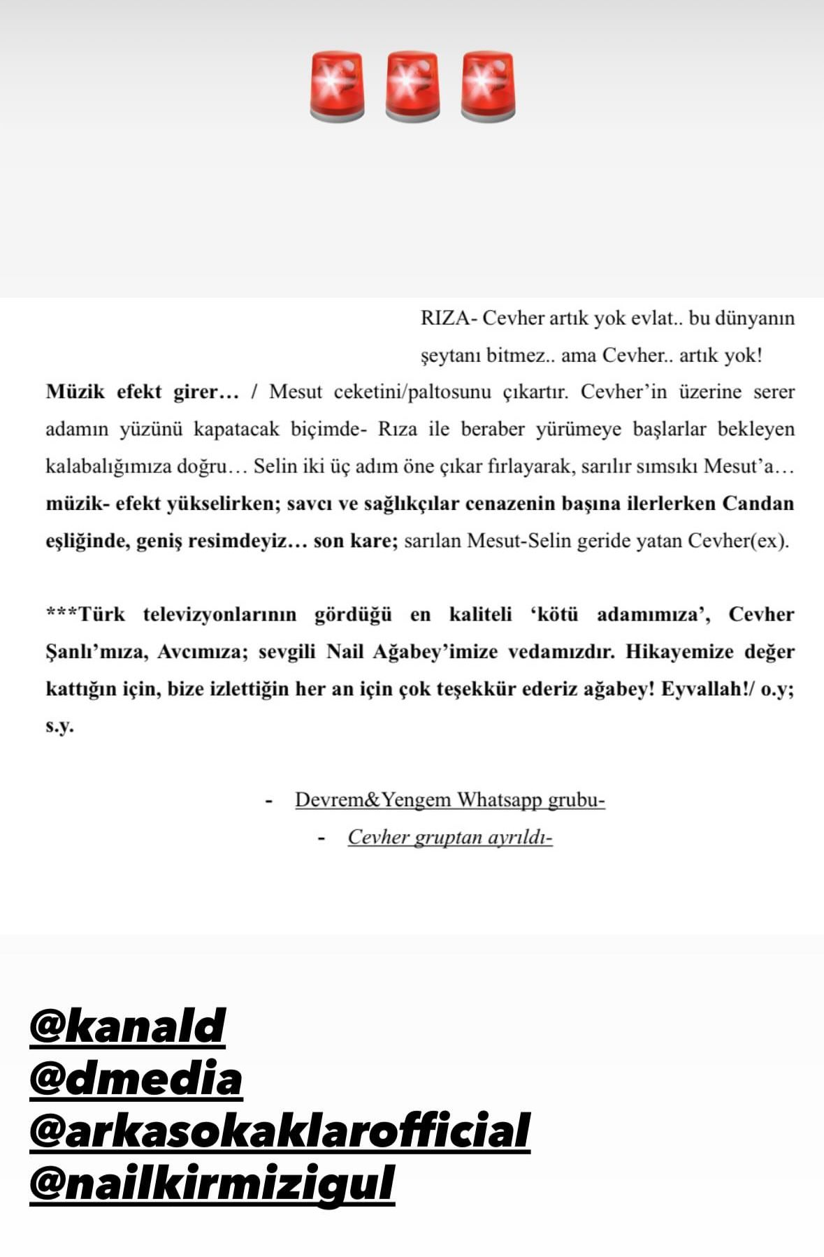 Arka Sokaklar'ın senaristi Ozan Yurdakul, sosyal medya platformu Instagram’dan dizi senaryosundaki Cevher Şanlı'nın veda sahnesini paylaştı.