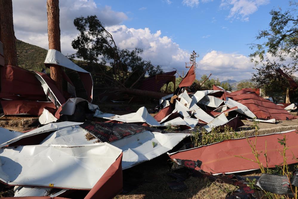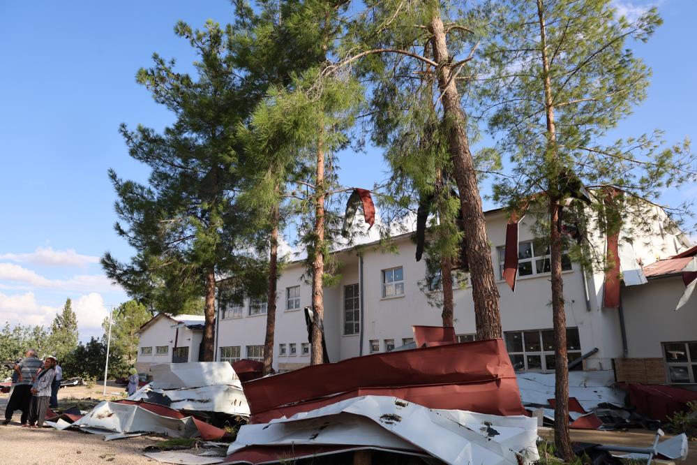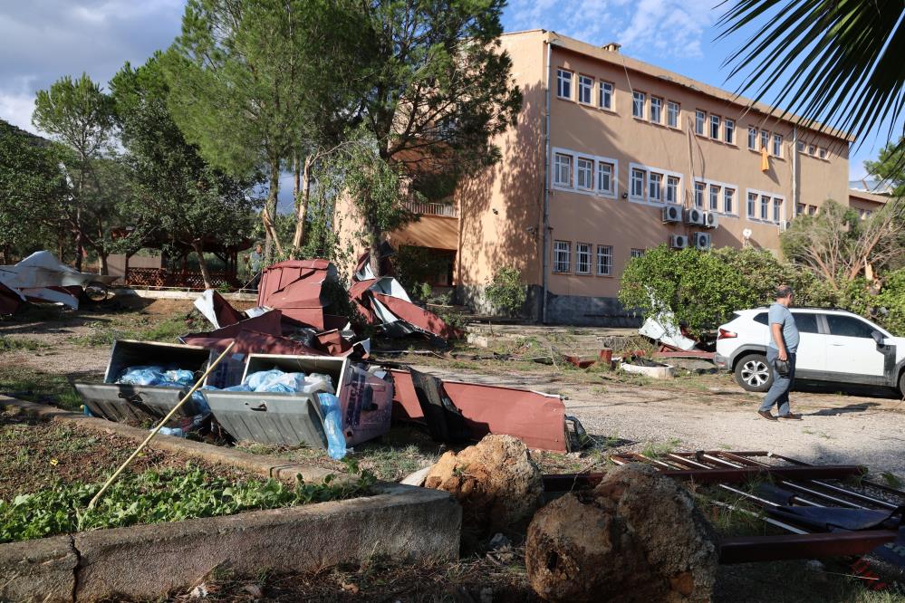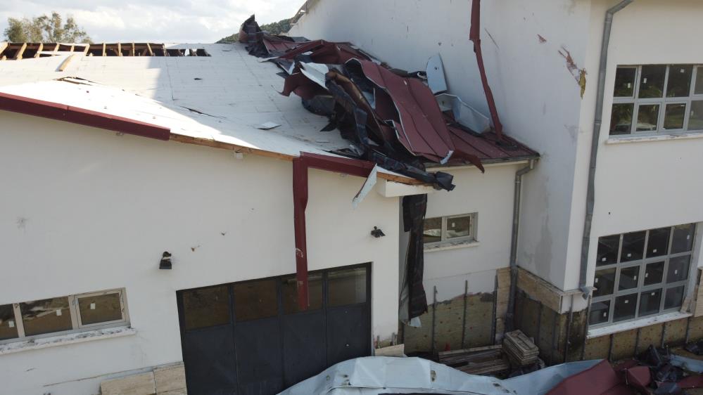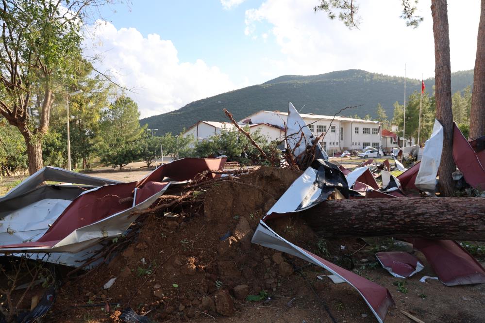 Yaklaşık 160 öğrencinin eğitim gördüğü okulda yarım asırlık çam ağaçları kökünden söküldü, demir direkler eğildi, okulun çatısı çevredeki ağaçların üzerine uçtu.