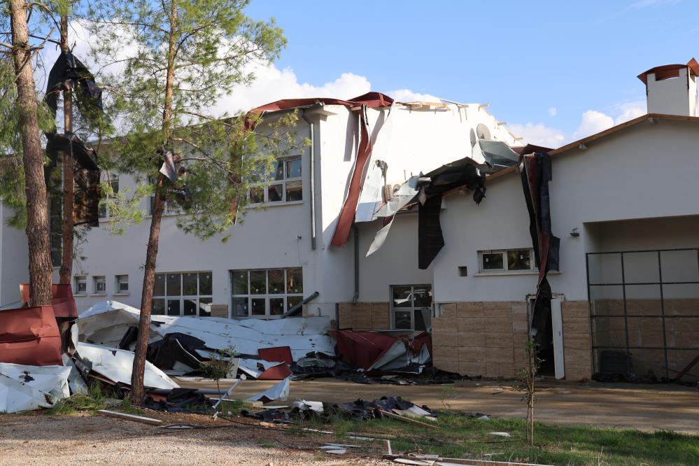 Bucak Mahallesi'nde etkili olan hortum, Bucak Çok Programlı Anadolu Lisesi'ne ciddi oranda zarar verdi.