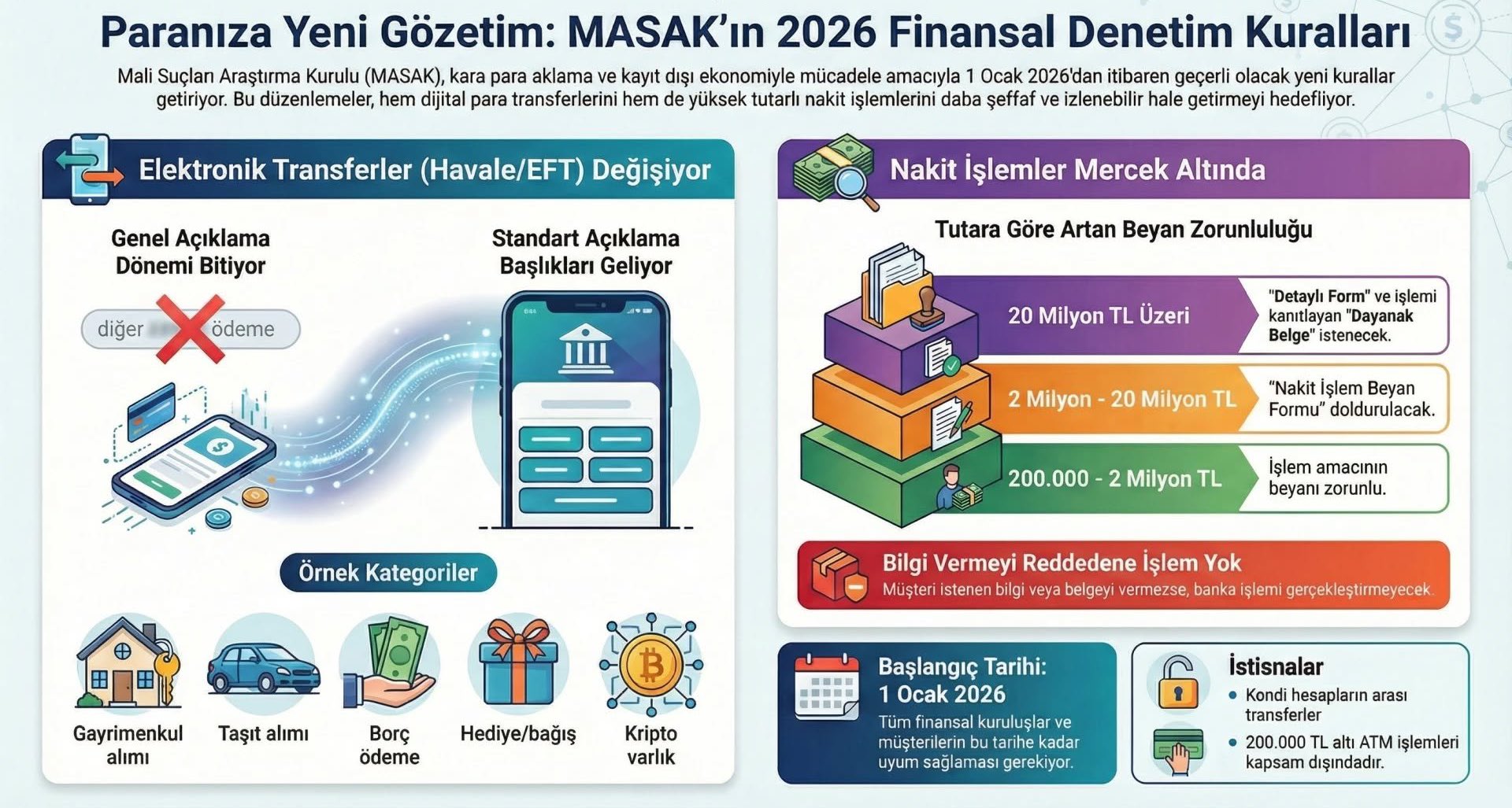 1 Ocak 2026 itibarıyla yürürlüğe girecek yeni düzenlemeyle MASAK, 200 bin TL ve üzerindeki para transferlerinde kanal ayrımı yapmaksızın (mobil, internet veya ATM) tüm kullanıcıların 20 kelimeden uzun bir açıklama yazmasını zorunlu hale getirecek.