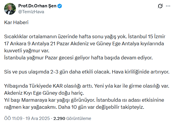 Yılbaşında Türkiye’de kar olasılığı arttı. Yeni yıla kar ile girme olasılığı var. Akdeniz, Kıyı Ege, Güneydoğu hariç. Yılbaşı Marmara’ya kar yağışı görünüyor.İstanbul’da ısı adası etkisine rağmen kar yağacak mı? Daha 10 gün var. Değişebilir, takipteyiz." açıklamasında bulundu.