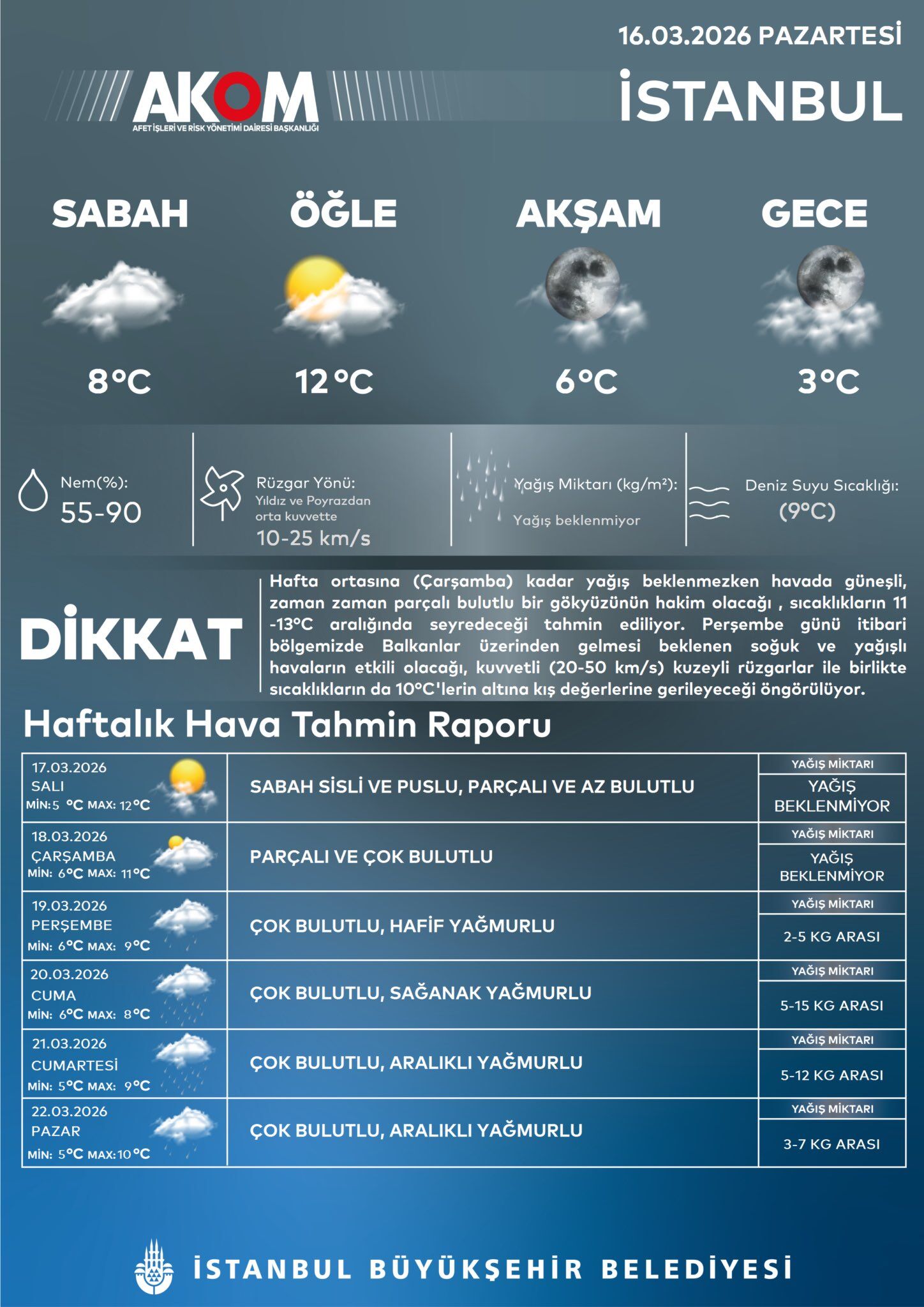 Rapora göre, "Hafta ortasına (Çarşamba) kadar yağış beklenmezken; havada güneşli, zaman zaman parçalı bulutlu bir gökyüzünün hâkim olacağı ve sıcaklıkların 11-13°C aralığında seyredeceği tahmin ediliyor.