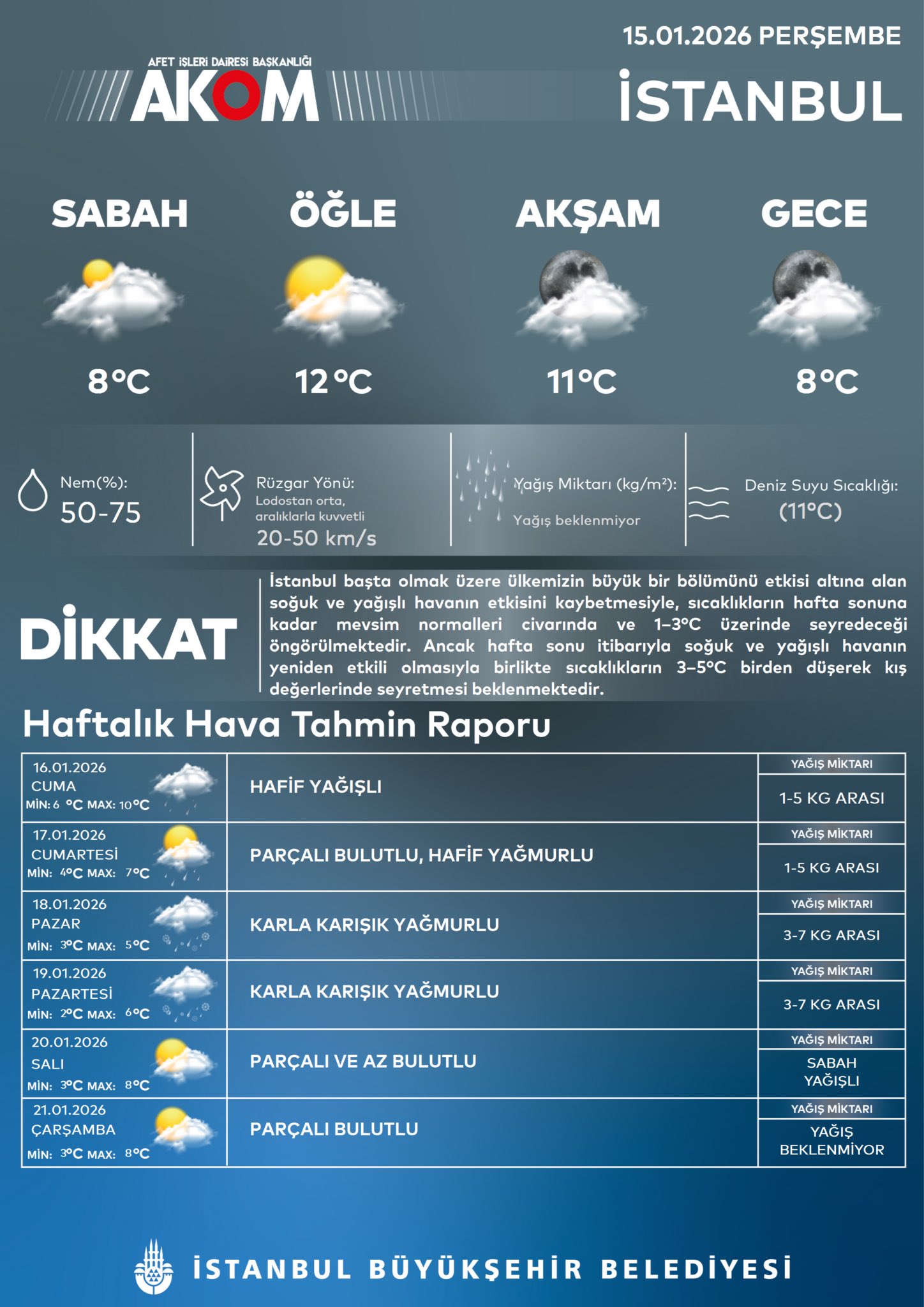 Pazar ve pazartesi günü İstanbul’a karla karışık yağmur bekleniyor. Hava sıcaklıklarının ise 5-6 derece civarında olması tahmin ediliyor.