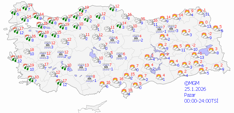 Meteoroloji Genel Müdürlüğü tarafından yapılan tahminlere göre: Ülkemiz genelinin parçalı ve çok bulutlu, Batı Karadeniz kıyıları dışında tüm yurdun yağışlı geçeceği tahmin ediliyor.