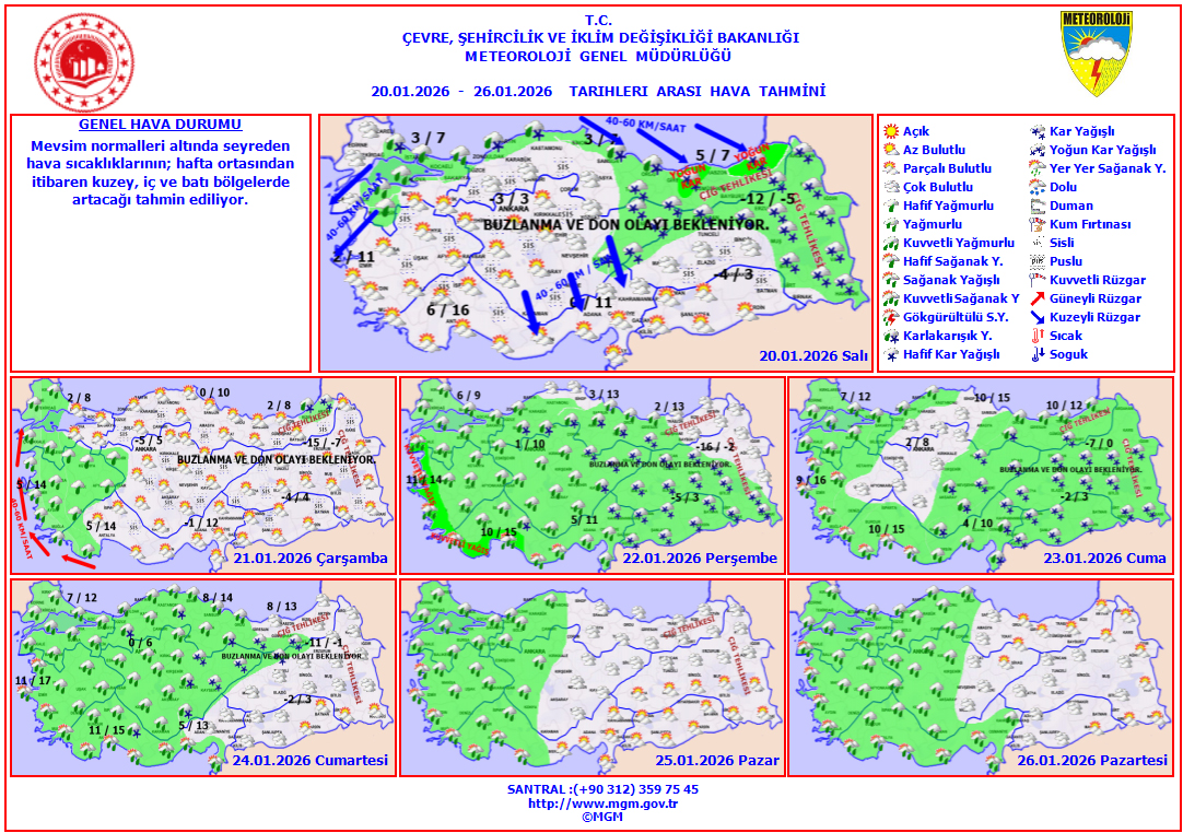 Meteorolojik değerlendirmelere göre; 22 Ocak Perşembe gününden itibaren Marmara, Ege, İç Anadolu ve Batı Karadeniz bölgelerinde hava sıcaklıklarının kademeli olarak artarak mevsim normalleri ve yer yer üzerine çıkması bekleniyor.