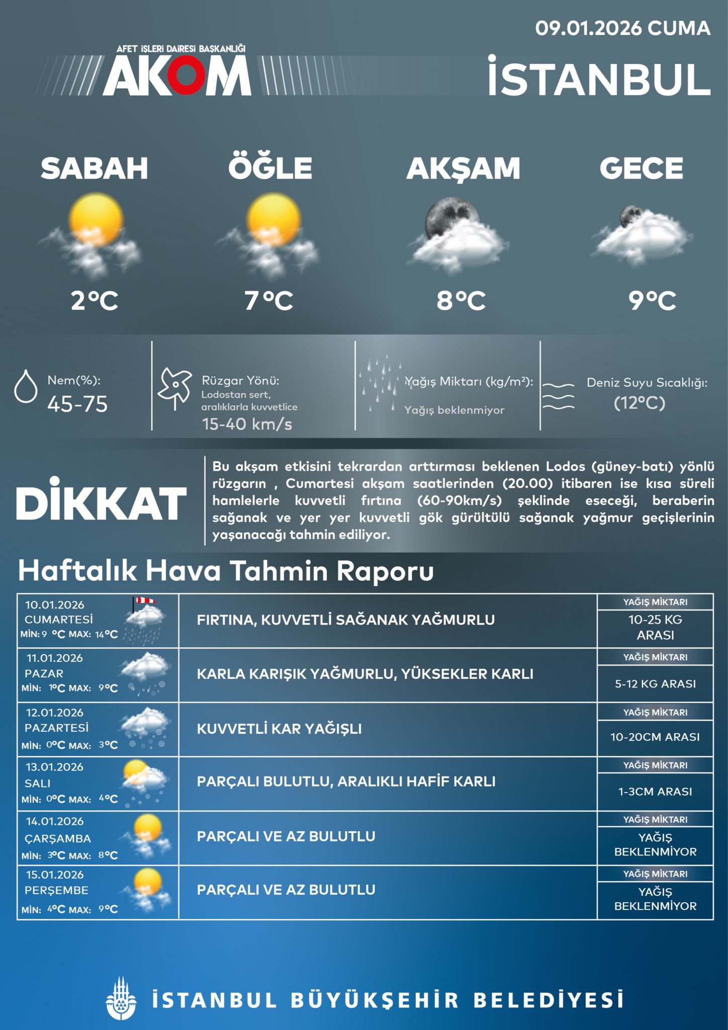 İstanbul Büyükşehir Belediyesi Afet Koordinasyon Merkezi (AKOM) İstanbul için kuvvetli kar yağışı uyarısında bulundu.