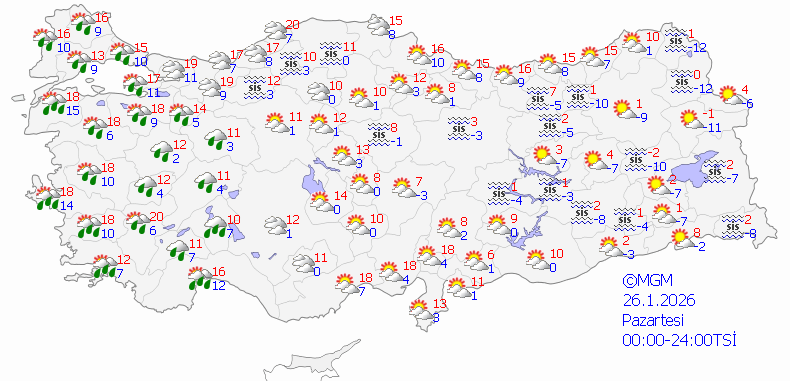 İçişleri Bakanlığı'nın sosyal medya hesabından yapılan paylaşımda 26 Ocak 2026 Pazartesi günü;, Burdur'un doğu ilçeleri, Antalya merkez ve batısında, gece saatlerinden itibaren Antalya'nın doğusunda yerel olarak çok kuvvetli ve yer yer şiddetli sağanak ve gök gürültülü sağanağın beklendiği belirtildi.