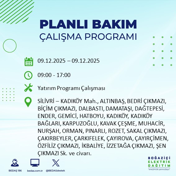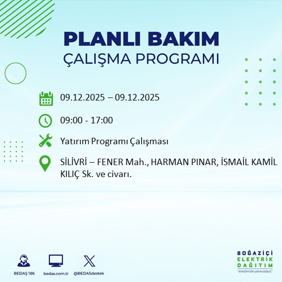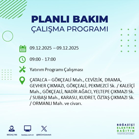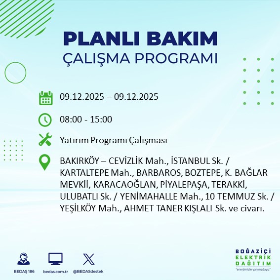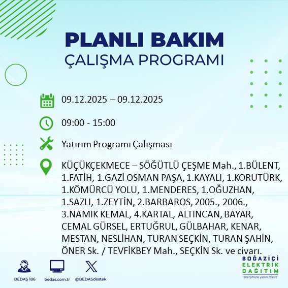 BEDAŞ, şebeke bakım ve altyapı iyileştirme çalışmaları kapsamında 8 Aralık Pazartesi günü Avrupa Yakası'nın büyük bölümünde elektrik kesintisine gidileceğini açıkladı.