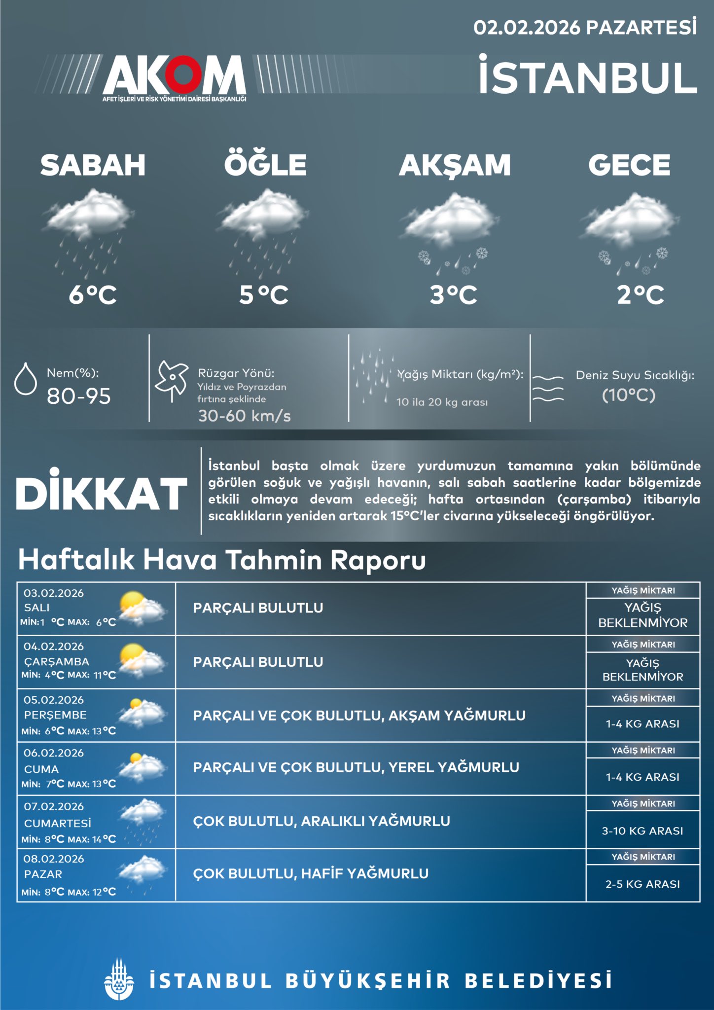 İstanbul Büyükşehir Belediyesinden (İBB), yapılan açıklamada, Orta Akdeniz ve Balkanlar üzerinden gelen sistemlerin birleşmesiyle İstanbul genelinde şiddetli yağışlar olduğu, yağışların ilerleyen saatlerde fırtınayla birlikte etkisini daha da artırmasının beklendiği yönünde Afet Koordinasyon Merkezinin (AKOM) değerlendirmeleri aktarıldı.