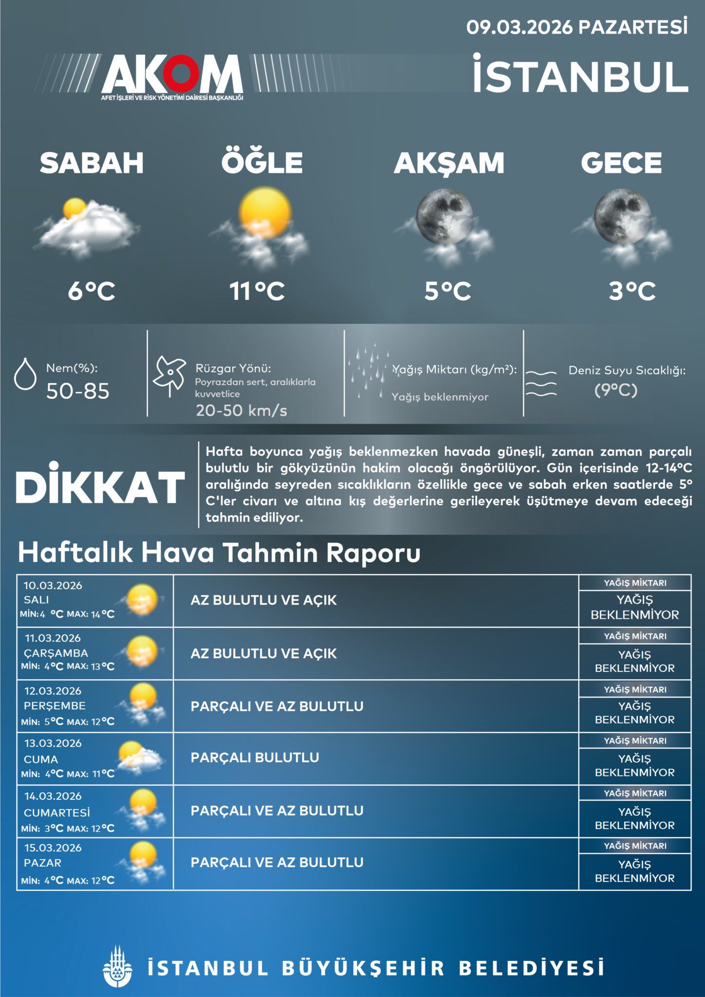 AKOM’dan yapılan değerlendirmelere göre ise hafta boyunca yağış beklenmiyor. Havada güneşli ve parçalı bulutlu bir gökyüzünün hakim olacağı öngörülüyor.