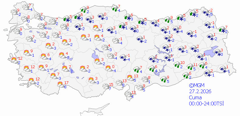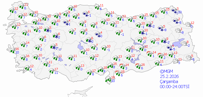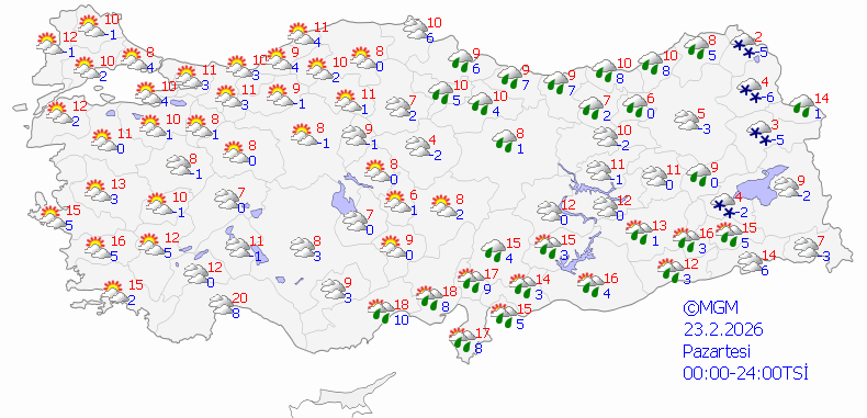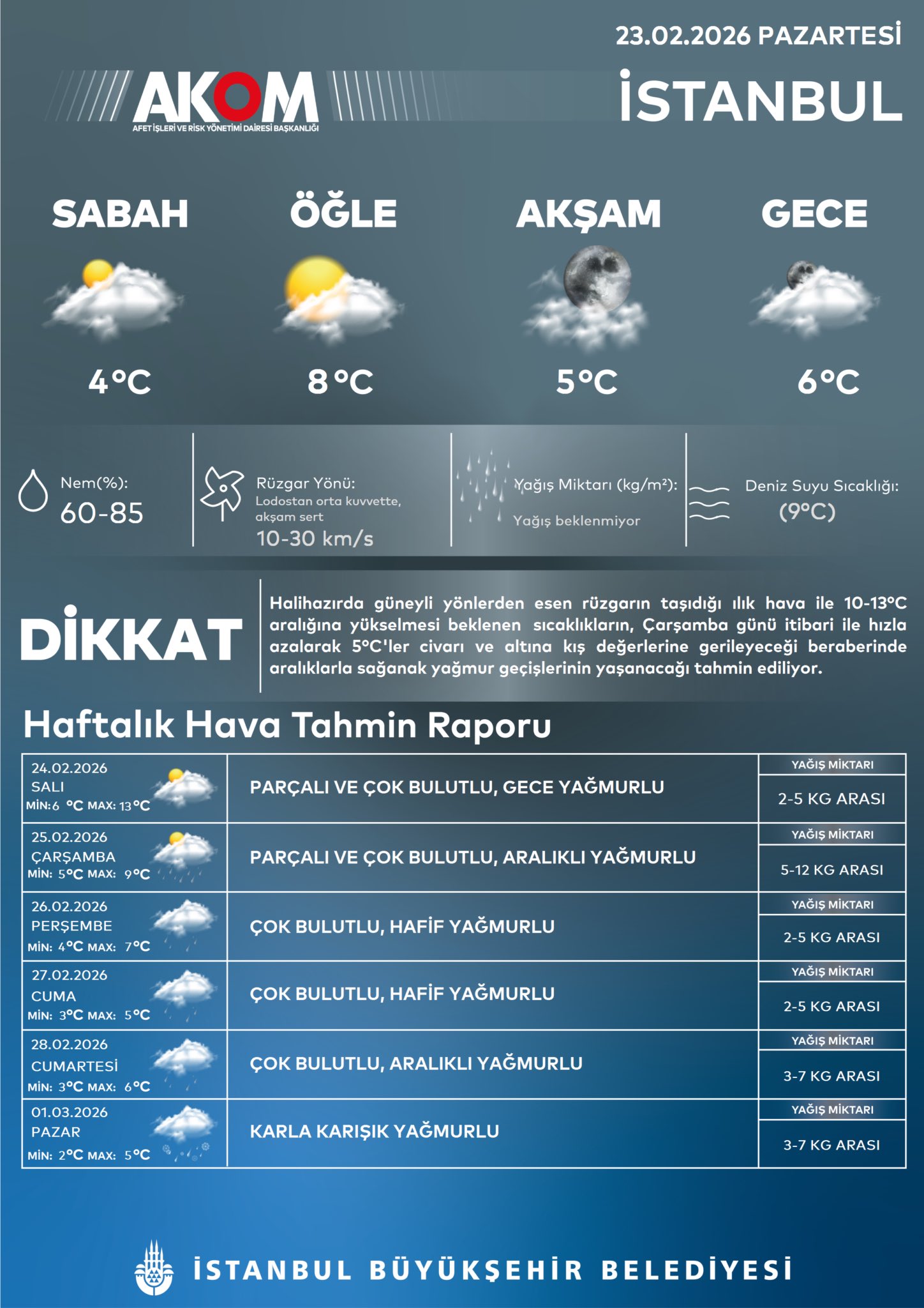 Meteoroloji Genel Müdürlüğü ve İstanbul Büyükşehir Belediyesi Afet Koordinasyon Merkezi (AKOM), 23 Şubat Pazartesi (bugün) hava durumu tahmin raporunu yayınladı.