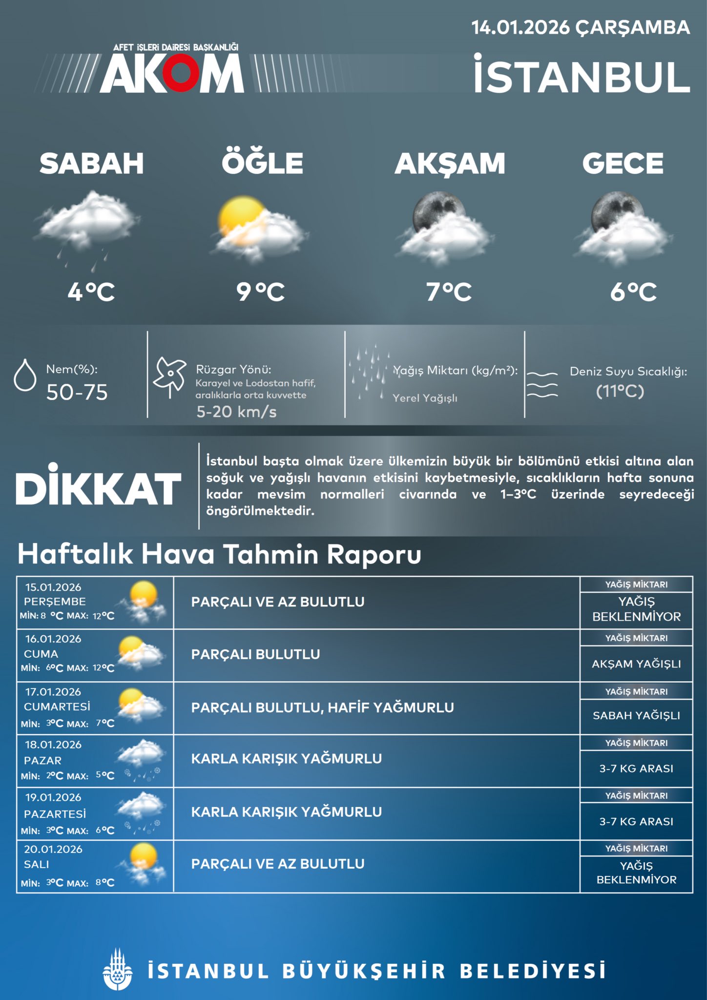 İstanbul Büyükşehir Belediyesi Afet Koordinasyon Merkezinden (AKOM) ve Meteoroloji Genel Müdürlüğünden İstanbul'a hafta sonu için kar uyarısı geldi.