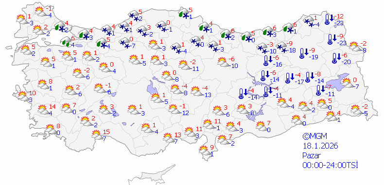 Meteoroloji Genel Müdürlüğü tarafından yapılan tahminlere göre, ülke geneli parçalı ve çok bulutlu, Marmara’nın doğusu, Batı Karadeniz, Orta ve Doğu Karadeniz kıyıları, Doğu Anadolu (Malatya hariç), Güneydoğu Anadolu'nun doğusu ile Eskişehir, Sivas ve Tokat çevrelerinin yağışlı; kıyıların karla karışık yağmurlu, iç kesimlerin kar yağışlı geçeceği tahmin ediliyor.
