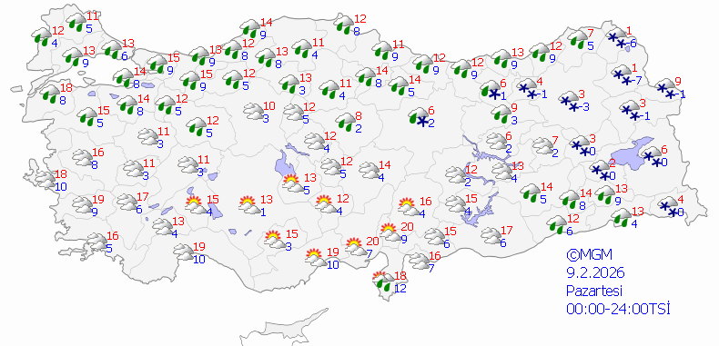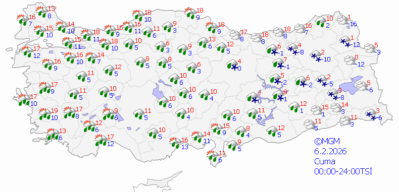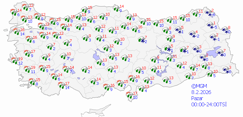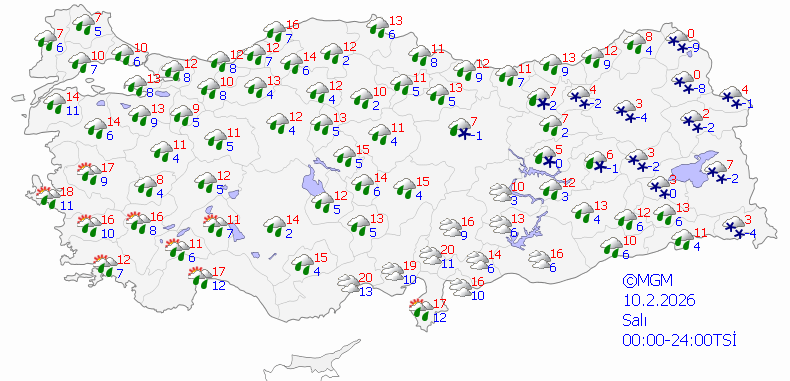 Meteoroloji Genel Müdürlüğü'nün son değerlendirmelerine göre ülke genelinde çok bulutlu ve yağışlı hava etkisini gösterecek. Yağışların birçok bölgede sağanak ve kar şeklinde görülmesi bekleniyor.