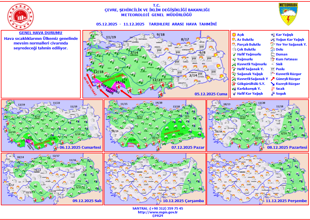 Yağışların; Batı Akdeniz, İzmir ve Aydın kıyıları ile Denizli'nin güney ilçelerinde kuvvetli, Antalya ve Muğla çevrelerinde yerel çok kuvvetli ve şiddetli olması bekleniyor.