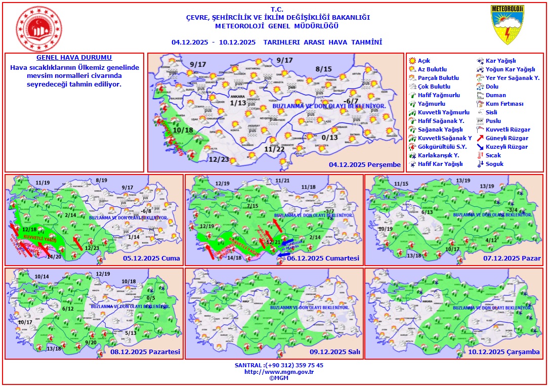 Hava sıcaklıklarının ülkemiz genelinde mevsim normalleri civarında seyredileceği tahmin ediliyor. Rüzgarın genellikle Akdeniz ve Güneydoğu Anadolu'da kuzeyli yönlerden hafif, ara sıra orta kuvvette esmesi bekleniyor.