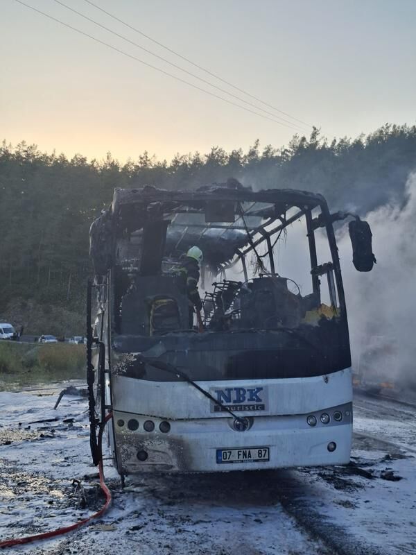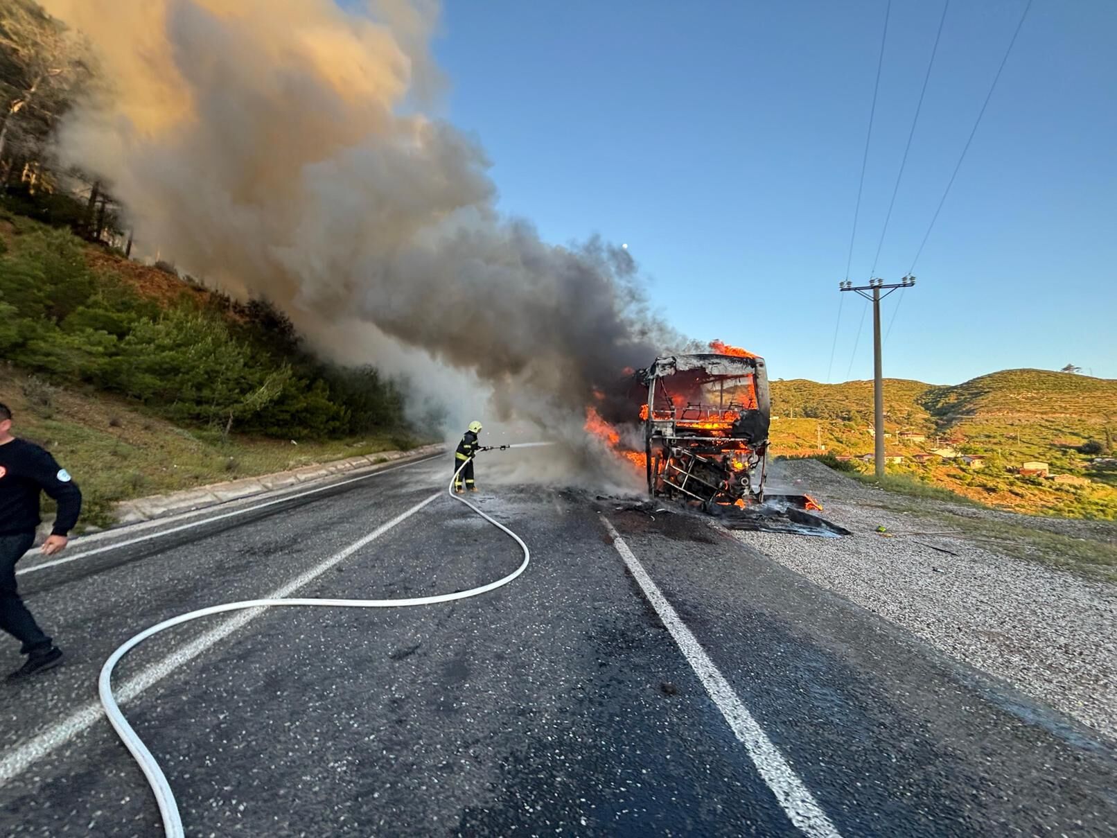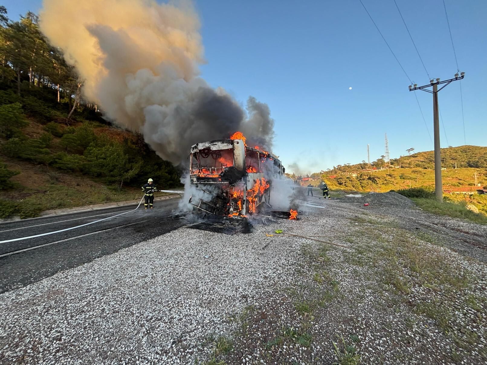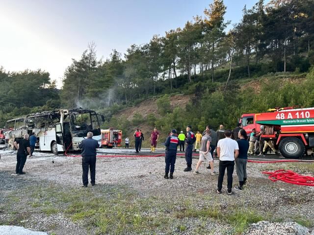 Marmaris Datça Karayolu'na seyir halindeyken yanmaya başlayan tur otobüsü kısa sürede alev topuna dönerken, yolcuların tahliye edilmesiyle facia önlendi, yangın ekiplerin hızlı müdahalesiyle ormana sıçramadan söndürüldü.