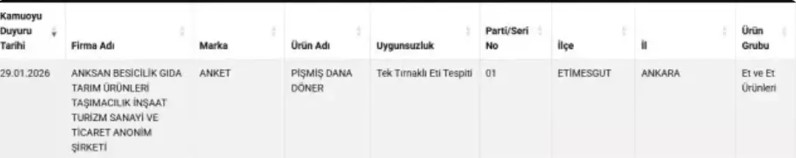 Açıklanan bulgulara göre, "Bu hafta sonuna özel ekstra indirim" ifadeleriyle zincir markette kampanyaya sokulan “Anket Pişmiş Dana Döner” ürününde tek tırnaklı et tespit edildi.