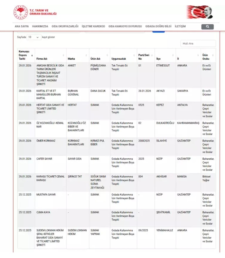 Tarım ve Orman Bakanlığı, kamuoyuyla paylaştığı liste sonrası yaptığı değerlendirmede, gıda güvenliğini tehlikeye atan uygulamalara karşı taviz verilmeyeceğini ifade edildi.