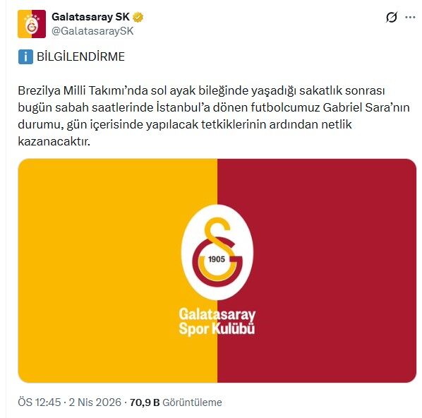 Sarı-kırmızılı kulüpten konuyla ilgili olarak yapılan açıklamada, “Brezilya Milli Takımı’nda sol ayak bileğinde yaşadığı sakatlık sonrası bugün sabah saatlerinde İstanbul’a dönen futbolcumuz Gabriel Sara’nın durumu, gün içerisinde yapılacak tetkiklerinin ardından netlik kazanacaktır” denildi.
