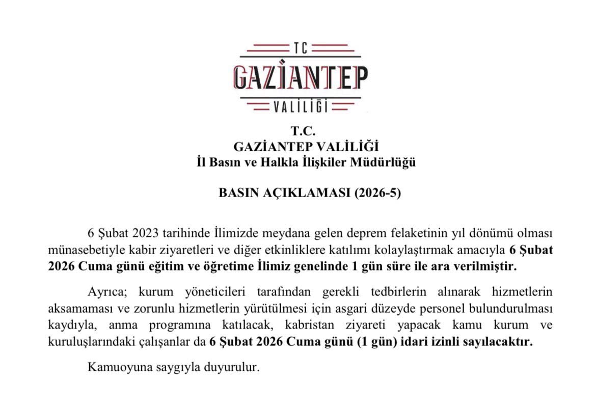 Gaziantep Valiliği tarafından yapılan açıklamada kabir ziyaretleri ve diğer etkinlikler gereği 1 gün eğitim ve öğretime ara verildiği ifade edilerek, “6 Şubat 2023 tarihinde ilimizde meydana gelen deprem felaketinin yıl dönümü olması münasebetiyle kabir ziyareti ve diğer etkinliklere katılımı kolaylaştırmak amacıyla 6 Şubat 2016 Cuma günü eğitim ve öğretime ilimiz genelinde 1 gün süre ile ara verilmiştir. Ayrıca; kurum yöneticileri tarafından gerekli tedbirlerin alınarak hizmetlerin aksamaması ve zorunlu hizmetlerin yürütülmesi için asgari düzeyde personel bulundurulması kaydıyla, anma programına katılacak, kabristan ziyareti yapacak kamu kurum ve kuruluşlardaki çalışanlar da 6 Şubat 2016 Cuma günü 1 gün idari izinli sayılacaktır” denildi.
