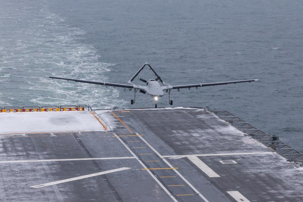 Şiddetli rüzgar ve yoğun kar yağışına rağmen, Milli SİHA Bayraktar TB3, TCG Anadolu’nun kısa pistinden otonom olarak havalandı.