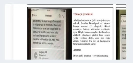 Bir diğer mesajda ise, "Yapay zekâ dijital ordumuzu (etki aracı) devreye soktuk; Böyle hassas araçları kullanırken dikkatli olmalıyız çünkü bize resmi yetki verilmiş değil, ama ben riski aldım umarım bu siz ve kampanya tarafından dikkate alınır" ifadeleri dikkat çekti.