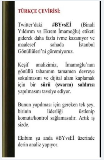 Jupiter1881: Twitter'daki #BYvsEİ (Binali Yıldırım vs Ekrem İmamoğlu) etiketi giderek daha fazla ivme kazanıyor ve maalesef sahada İstanbul Gönüllüleri'ni göremiyoruz. Keşif analizimiz, İmamoğlu'nun gönüllü tabanının tamamen devreye sokulmasını ve dijital alanı kaplamak için bir sürü (swarm) saldırısı yapılmasını tavsiye ediyor. Bunun yapılması için gereken tek şey, birinin liderliği üstlenip komuta/kontrol sağlamasıdır. Artık iş sizde. Ekibim şu anda #BYvsEİ üzerinde derin analiz yapıyor.