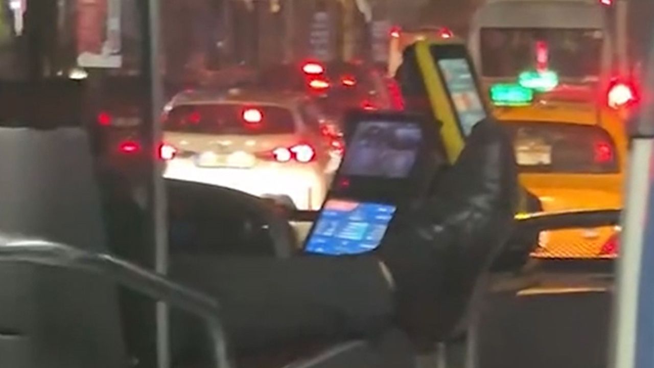 Seyir halindeki "622-Yenidoğan-Mecidiyeköy" seferini yapan otobüsün şoförü, sağ ayağını validatör cihazının bulunduğu bölüme uzattı.