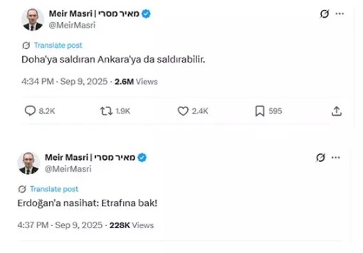 Masri, Arapça, Türkçe ve İbranice paylaşımlarında doğrudan Türkiye’yi hedef almış “Doha’ya saldıran Ankara’ya da saldırabilir” demişti.