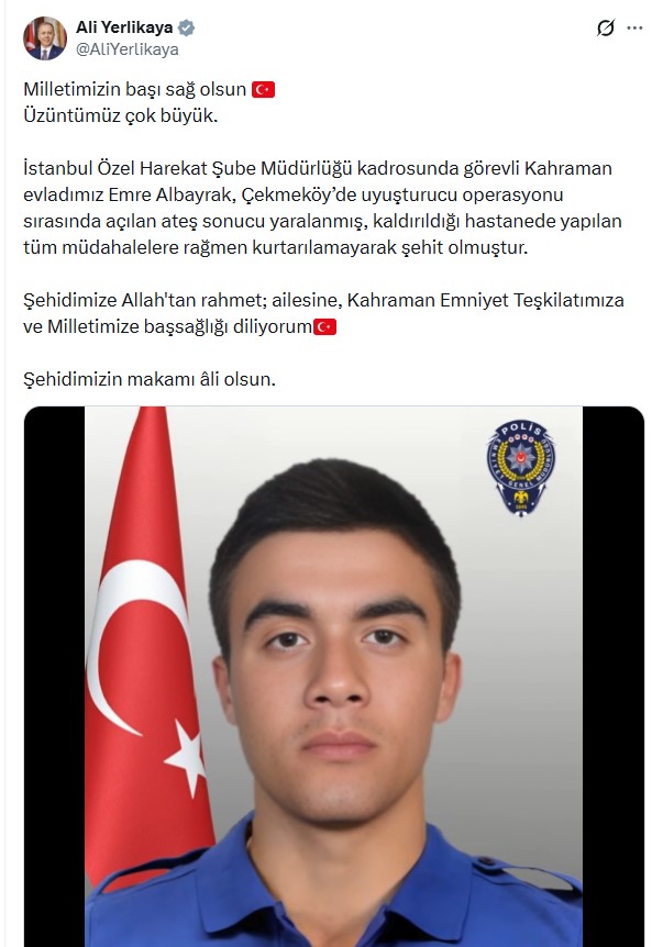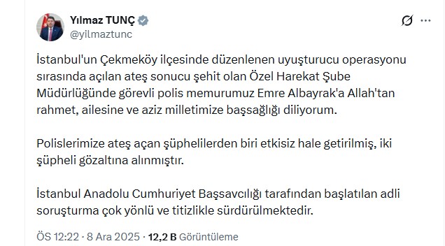 Adalet Bakanı Yılmaz Tunç, sosyal medya hesabından, “İstanbul'un Çekmeköy ilçesinde düzenlenen uyuşturucu operasyonu sırasında açılan ateş sonucu şehit olan Özel Harekat Şube Müdürlüğünde görevli polis memurumuz Emre Albayrak'a Allah'tan rahmet, ailesine ve aziz milletimize başsağlığı diliyorum. Polislerimize ateş açan şüphelilerden biri etkisiz hale getirilmiş, iki şüpheli gözaltına alınmıştır. İstanbul Anadolu Cumhuriyet Başsavcılığı tarafından başlatılan adli soruşturma çok yönlü ve titizlikle sürdürülmektedir" şeklinde açıklama yaptı.