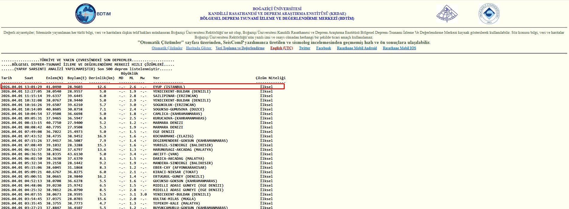 İstanbul'un Eyüpsultan ilçesinde saat 13:01'de 2.6 büyüklüğünde deprem meydana geldi.