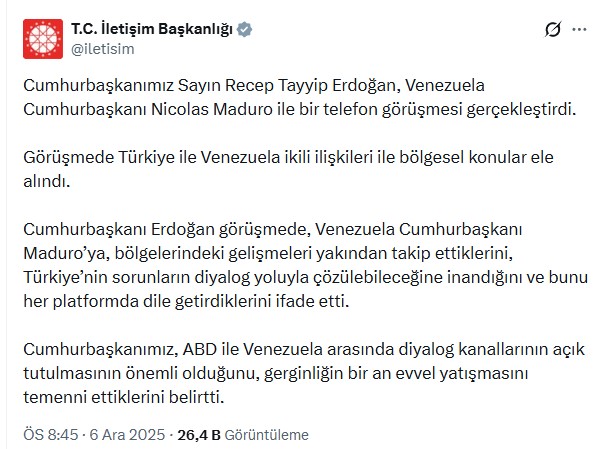 İletişim Başkanlığı, Cumhurbaşkanı Recep Tayyip Erdoğan'ın Venezuela Devlet Başkanı Maduro ile telefon görüşmesi gerçekleştirdiği duyurdu.