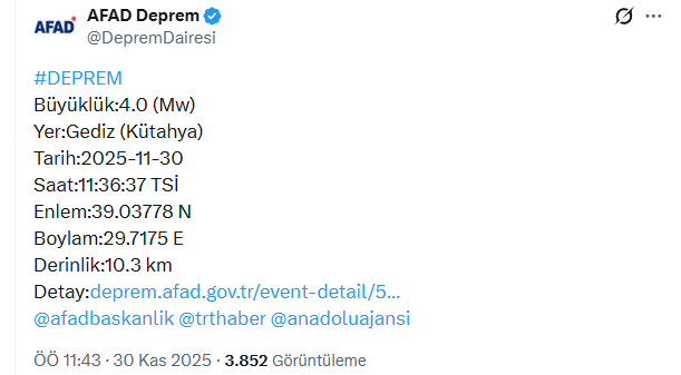 Afet ve Acil Durum Yönetimi Başkanlığının (AFAD) internet sitesinde yer alan bilgiye göre, merkez üssü Gediz ilçesi olan 4 büyüklüğünde sarsıntı kaydedildi.