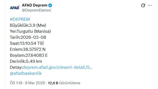 Afet ve Acil Durum Yönetimi Başkanlığı (AFAD) saat 13.10'da merkez üssü Turgutlu ilçesi olan 3,9 büyüklüğünde deprem meydana geldiğini açıkladı.