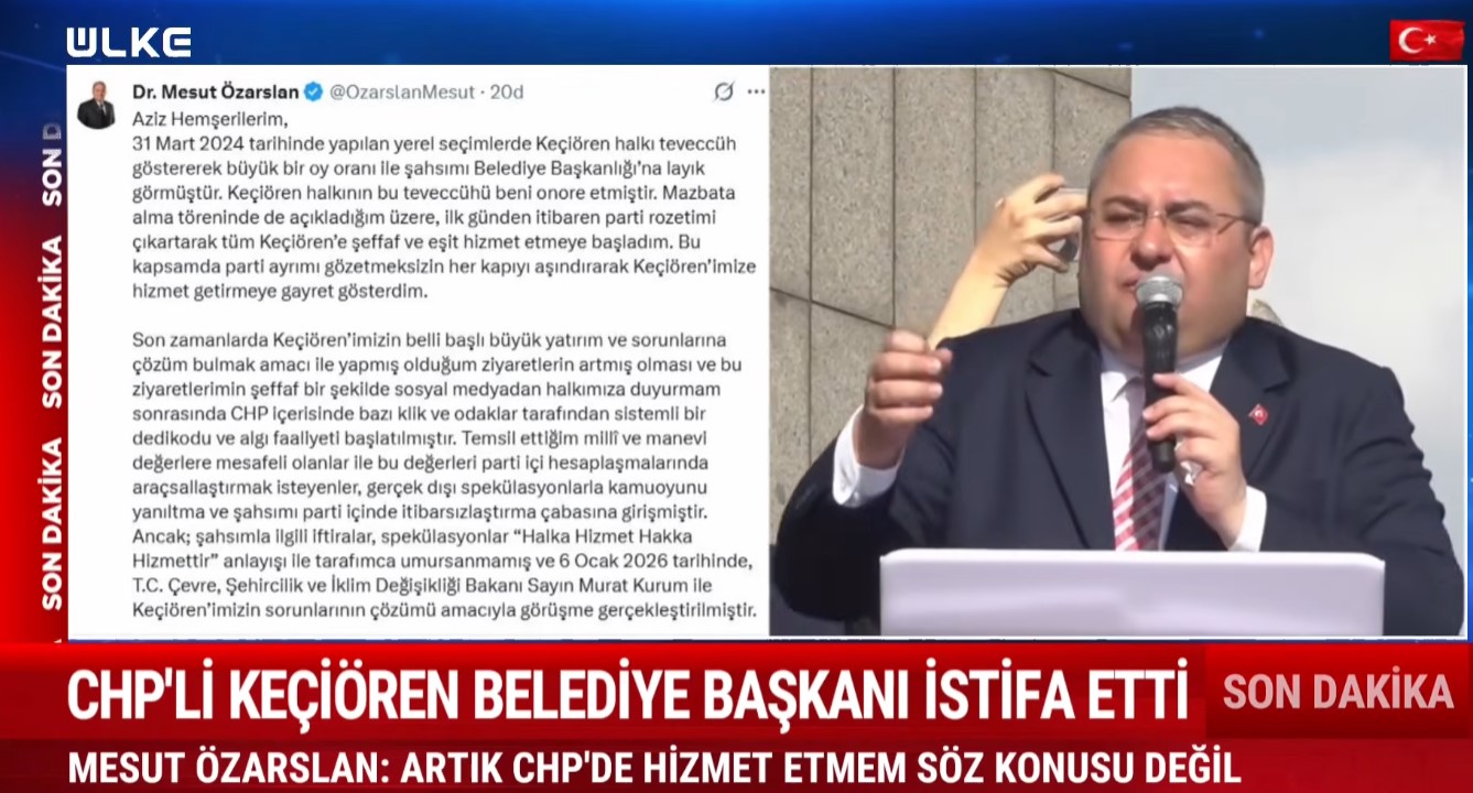 Ankara'nın Keçiören ilçesi Belediye Başkanı Mesut Özarslan, partisi CHP'den istifa ettiğini duyurdu.