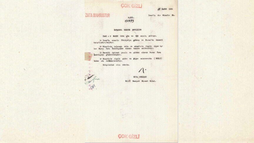 "İranlı misafir Türkiye'ye gelmiş ve Bursa'da ikameti kararlaştırılmıştır. Misafirin kalacağı evin ve misafirle ilgili diğer işler Bursa Yuva Amirliğince bizzat tanzim edilecektir. Gerekli talimat yazılı ve şifahi olarak Bursa Yuva Amirliği'ne gönderilmiştir. Misafirle ilgili şifre ve diğer muhaberatta 'belli' takma adı kullanılacaktır. Bilgilerini rica ederim."