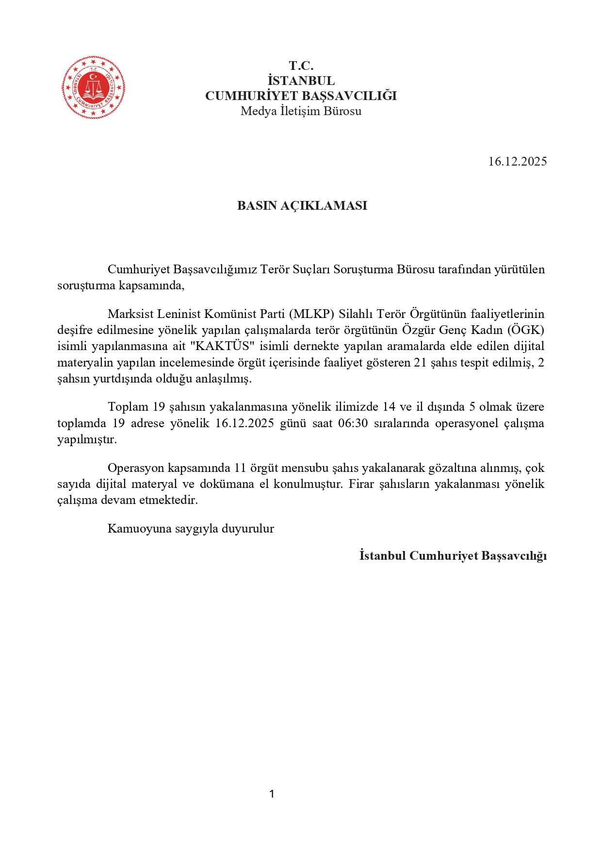 İstanbul Cumhuriyet Başsavcılığı, MLKP silahlı terör örgütünün faaliyetlerine yönelik soruşturma yürüttü.