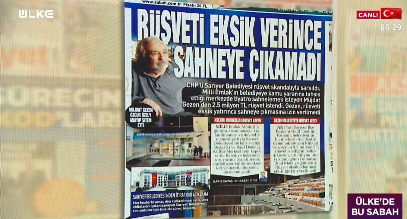 Sabah'ın haberine göre; CHP'li belediyenin yetkilileri tarafından sanatçı Müjdat Gezen'den sahneye çıkabilmesi için 2 milyon 500 bin lira rüşvet istendiği, Gezen'in ise istenen paranın 600 bin lirasını vermemesi üzerine ikinci kez gittiği kültür merkezine alınmadığı öne sürüldü.