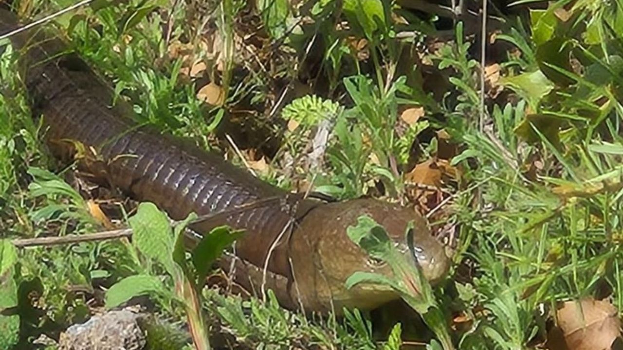 İlk bakışta yılanı andıran bu canlı, aslında halk arasında "demir yılan" olarak bilinen oluklu kertenkele (Pseudopus apodus) çıktı.
