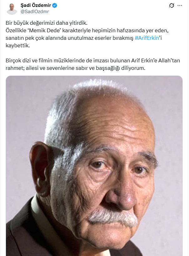 SON DAKİKA | Türk izleyicisinin 'Memik Dede' rolüyle kalbine kazıdığı usta oyuncu Arif Erkin Güzelbeyoğlu'nun beklenmedik ölüm haberi sanat camiasını ve sevenlerini yasa boğdu.