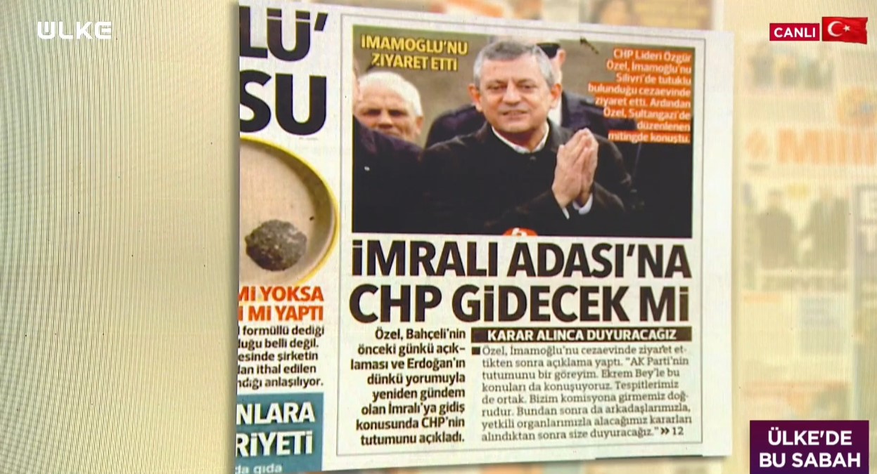 CHP lideri Özgür Özel, MHP Genel Başkanı Devlet Bahçeli'nin önceki günkü açıklaması ve Cumhurbaşkanı Erdoğan'ın dünkü yorumuyla yeniden gündem olan “İmralı'ya gidiş” konusunda CHP'nin tutumunu açıkladı.