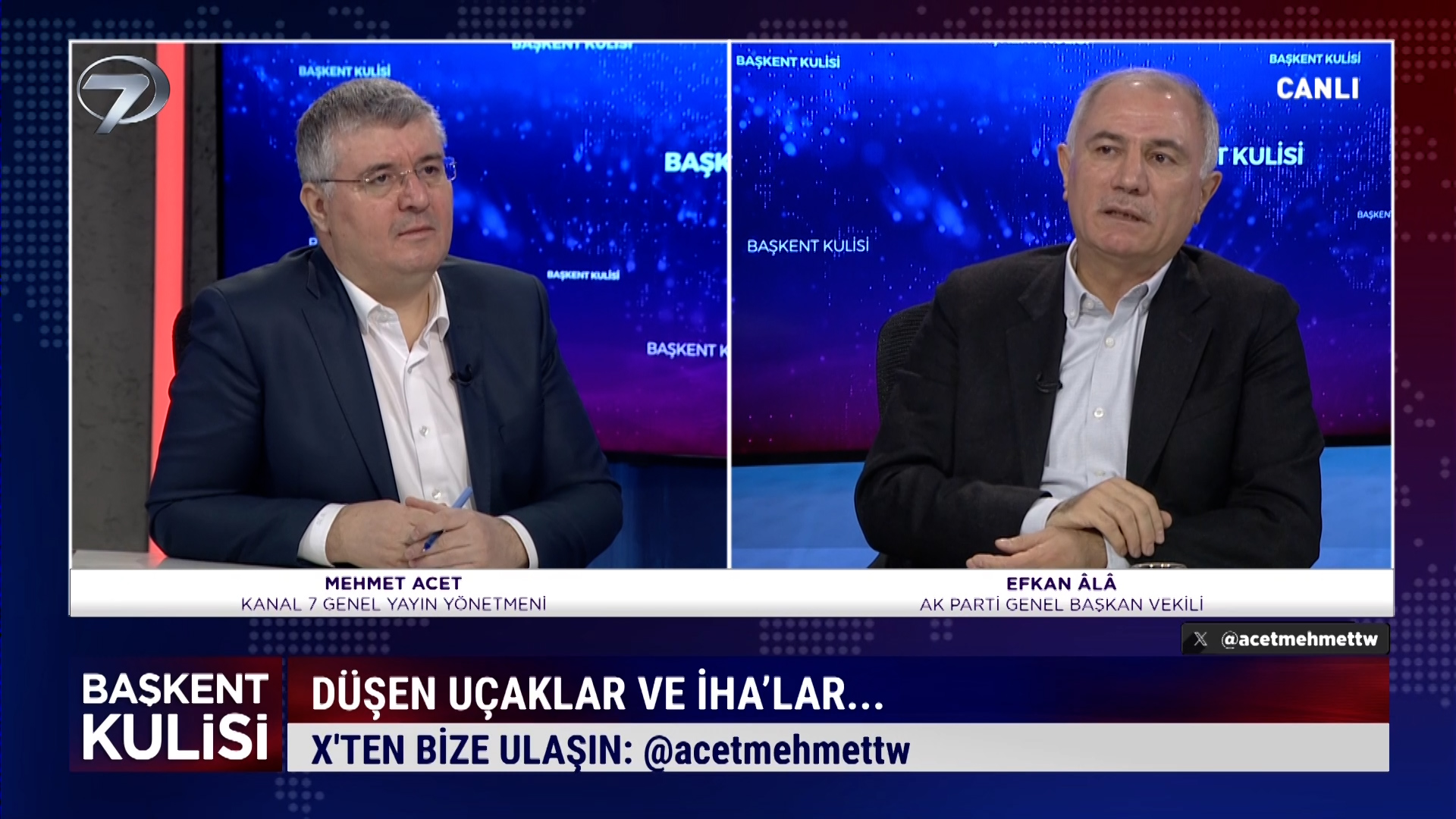 AK Parti Genel Başkan Vekili Efkan Ala, Kanal 7 ekranlarında yayınlanan Başkent Kulisi programında Kanal 7 Genel Yayın Yönetmeni ve Haber 7 Yazarı Mehmet Acet'in sorularını yanıtladı.