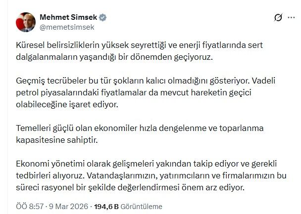 Küresel belirsizliklerin yüksek seyrettiği ve enerji fiyatlarında sert dalgalanmaların yaşandığı bir dönemden geçildiğine dikkati çeken Şimşek, "Geçmiş tecrübeler, bu tür şokların kalıcı olmadığını gösteriyor. Vadeli petrol piyasalarındaki fiyatlamalar da mevcut hareketin geçici olabileceğine işaret ediyor. Temelleri güçlü olan ekonomiler hızla dengelenme ve toparlanma kapasitesine sahiptir. Ekonomi yönetimi olarak gelişmeleri yakından takip ediyor ve gerekli tedbirleri alıyoruz. Vatandaşlarımızın, yatırımcıların ve firmalarımızın bu süreci rasyonel şekilde değerlendirmesi önem arz ediyor." ifadelerini kullandı.