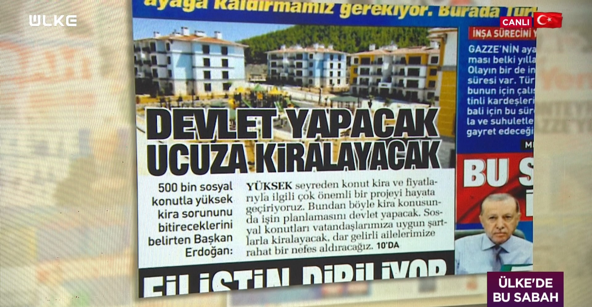 Cumhurbaşkanı Erdoğan, "Sosyal konutlarını bir kısmını vatandaşlarımıza uygun şartlarla kiralayacak, dar gelirli ailelerimize rahat bir nefes aldıracağız." ifadelerini kullandı.
