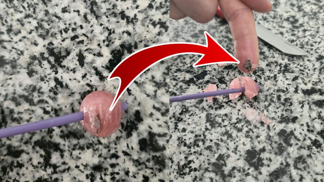 Bir süre şekeri yiyen çocuk, dişine sert bir cismin gelmesi üzerine durumu annesine bildirdi. Şekeri kontrol eden anne, içinde taş parçası olduğunu fark etti.