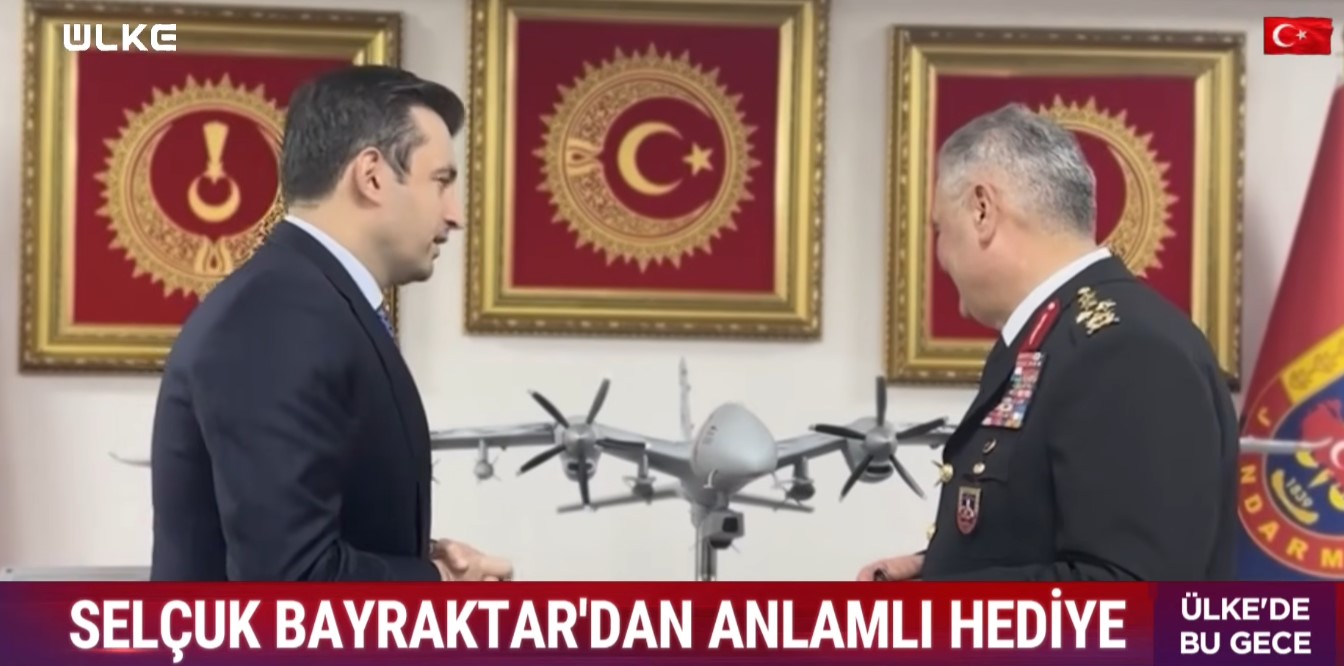 Ziyarette Bayraktar, Orgeneral Ali Çardakçı'ya Jandarma için özel olarak hazırlanan Bayraktar AKINCI maketini hediye etti.