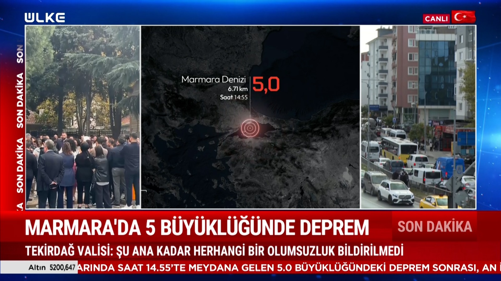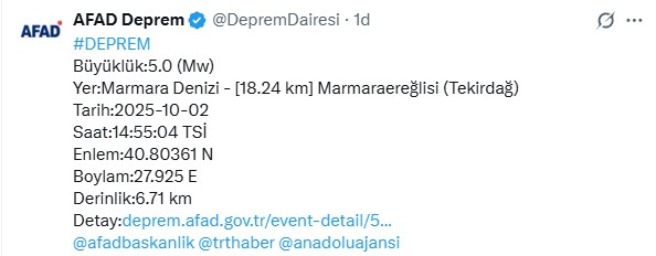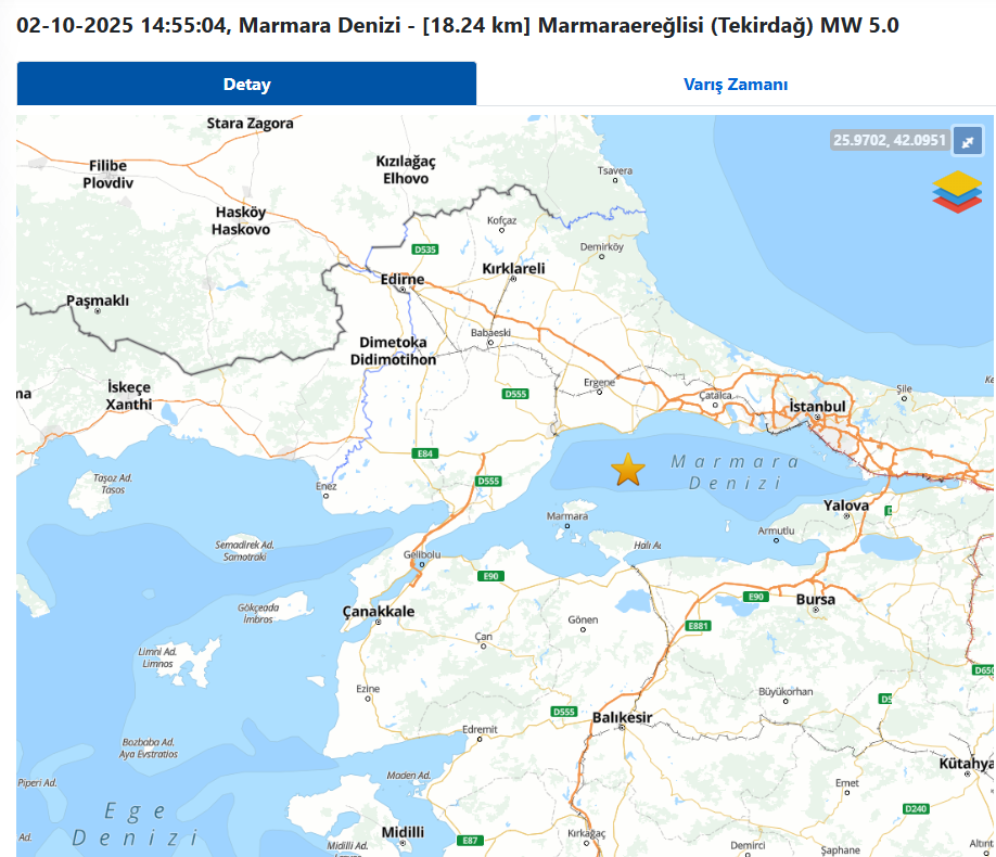 AFAD, Tekirdağ açıklarında Marmara Denizi'nin 18 kilometre derininde saat 14.55'te 5.0 büyüklüğünde deprem meydana geldiğini bildirdi.