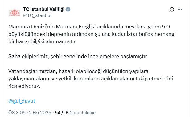 İçişleri Bakanı Ali Yerlikaya, "İstanbul ve çevre illerden de hissedilen depremle ilgili olarak, AFAD ve ilgili kurumlarımızın tüm ekipleri saha taramalarına başlamıştır." bilgisini paylaştı.
