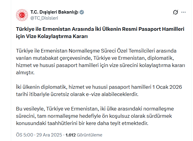 "Türkiye ile Ermenistan Normalleşme Süreci Özel Temsilcileri arasında varılan mutabakat çerçevesinde, Türkiye ve Ermenistan, diplomatik, hizmet ve hususi pasaport hamilleri için vize sürecini kolaylaştırma kararı almıştır. İki ülkenin diplomatik, hizmet ve hususi pasaport hamilleri 1 Ocak 2026 tarihi itibariyle ücretsiz olarak e-vize alabileceklerdir. Bu vesileyle, Türkiye ve Ermenistan, iki ülke arasındaki normalleşme sürecini, tam normalleşme hedefiyle ön şartsız olarak sürdürmek konusundaki taahhütlerini bir kere daha teyit etmektedir."
